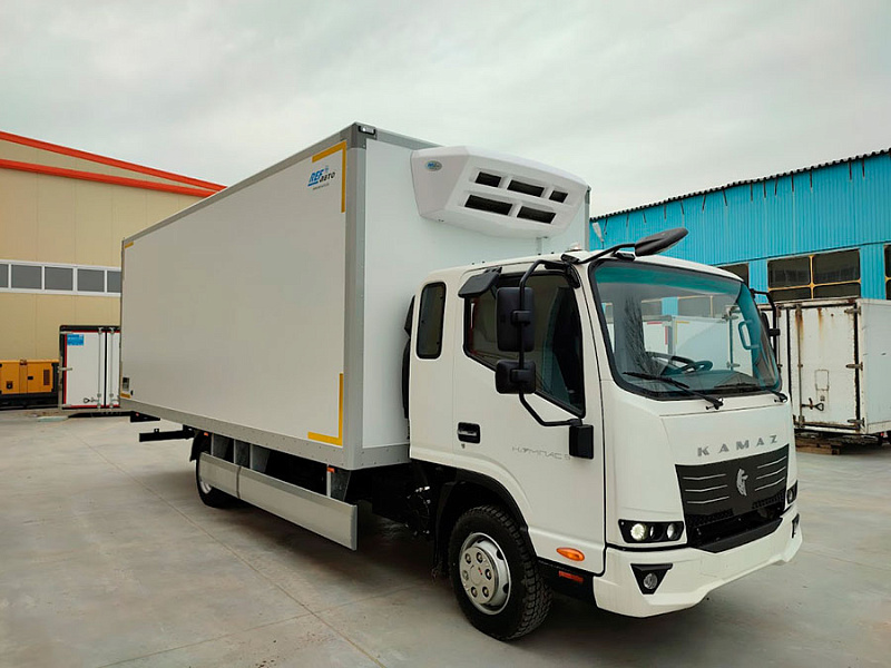Модель КАМАЗ Компас 9 оснащен изотермическим фургоном, который позволяет поддерживать постоянную температуру в грузовом отсеке благодаря герметичным сэндвич-панелям. Это удобно для перевозки скоропортящихся товаров, например: